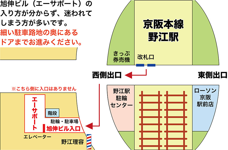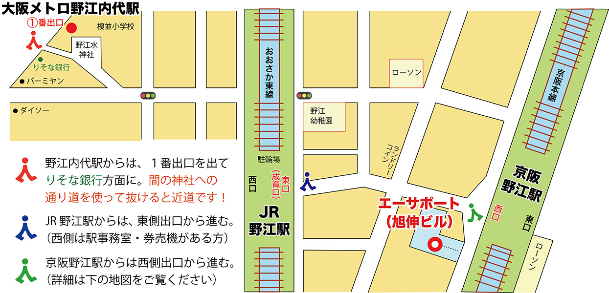 京阪本線「野江」駅より徒歩0分。 JRおおさか東線「JR野江」駅より徒歩2分。 大阪メトロ「野江内代」駅より徒歩10分。